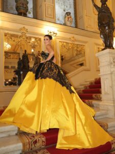 جاء الجزء العلوي من الفستان من الدانتيل الأسود الفاخر بزخارف أنيقة وياقة على شكل قلب (كورسيه) أبرزت جمال قوامها بانسيابية راقية، بينما انساب الجزء السفلي واسعًا ومنفوشًا بطبقات من القماش اللامع باللون الذهبي المشرق، مانحًا الإطلالة طابعًا ملكيًا متكاملًا يليق بأجواء الحفل الفخم.