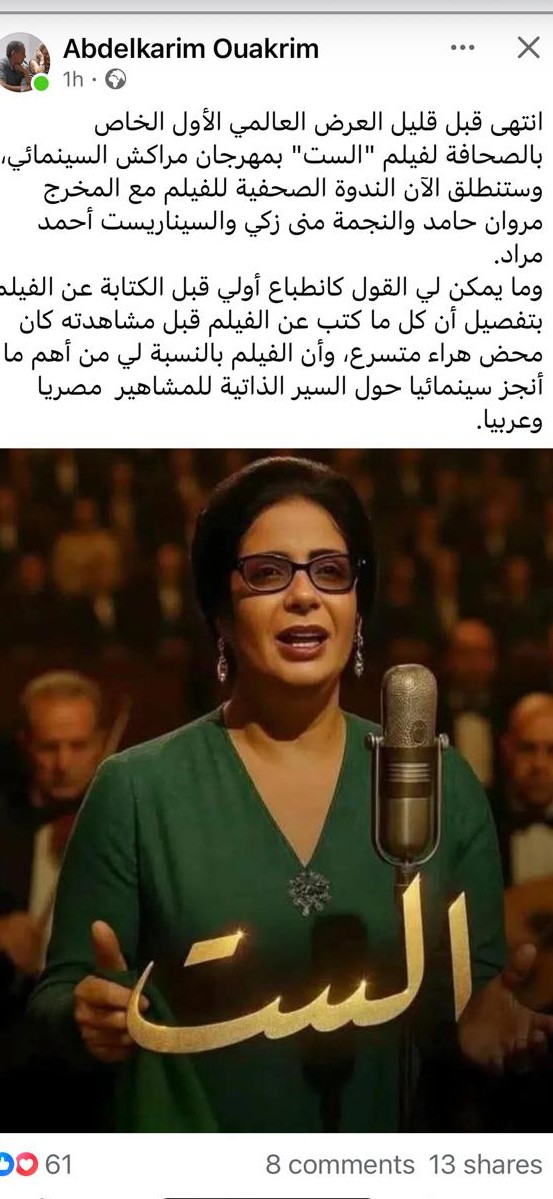 أشاد الناقد السينمائي والكاتب الصحفي المغربي عبد الكريم واكريم، رئيس تحرير مجلة سنفيليا، بفيلم «الست» بطولة النجمة منى زكي، وذلك بعد عرضه الخاص للصحفيين في الدورة الـ22 من المهرجان الدولي للفيلم بمراكش، قبل عرضه العالمي الأول مساء اليوم.