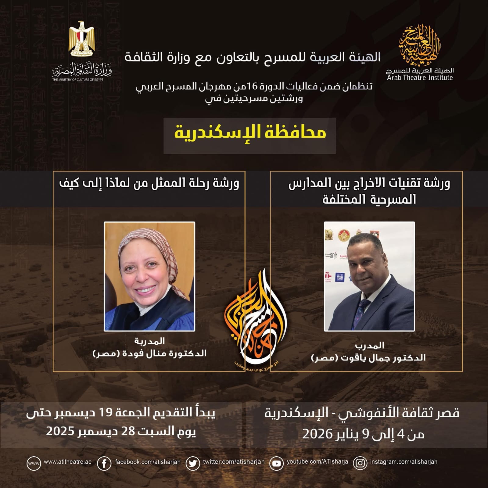مهرجان المسرح العربي يفتح باب الاشتراك في 6 ورش فنية بالإسكندرية وأسوان والإسماعيلية