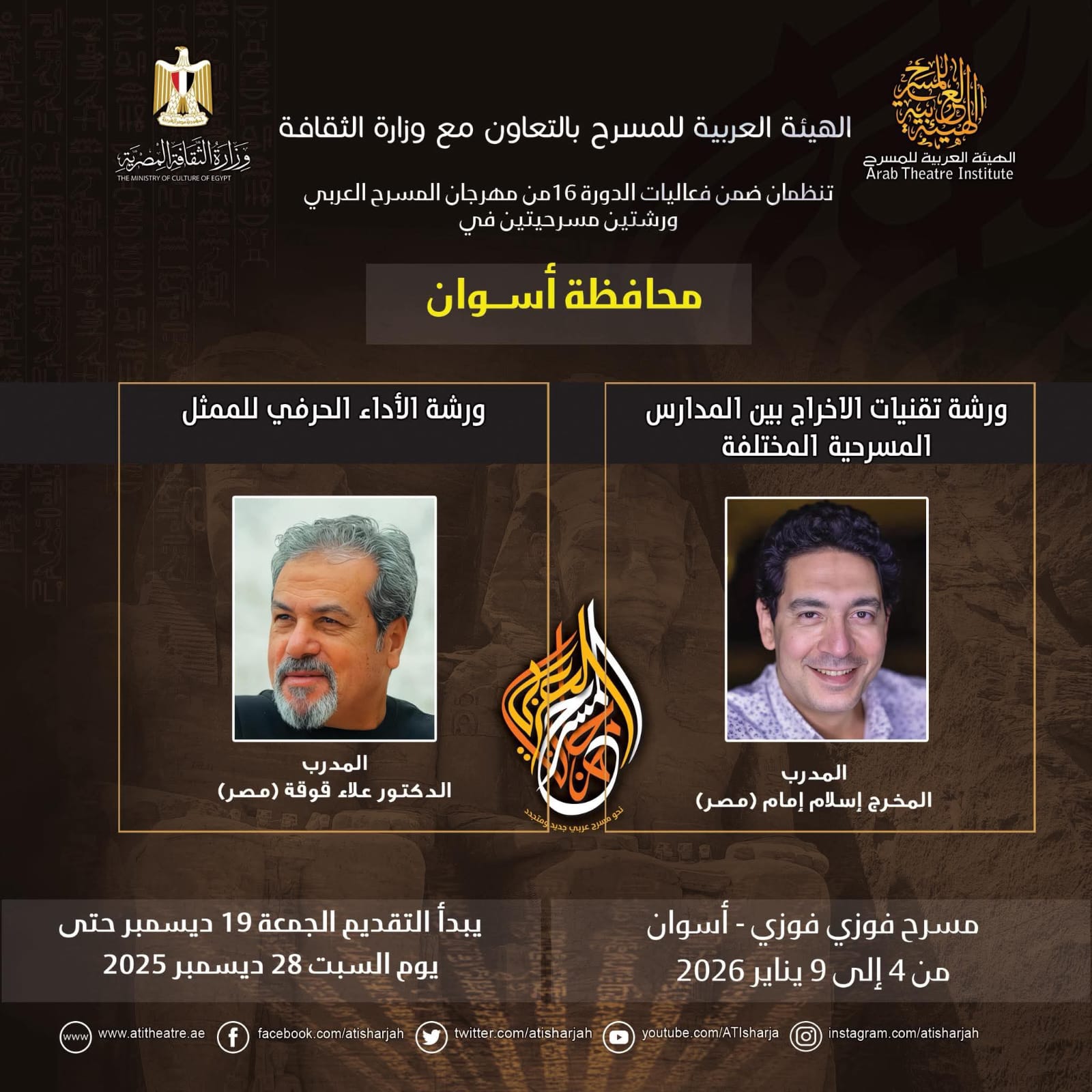 وفي سياق الاستعداد لانطلاق فعاليات المهرجان، أعلنت إدارته عن تنظيم 6 ورش فنية متخصصة في مجالات التمثيل، والإخراج، والديكور المسرحي، وذلك خلال الفترة من 4 إلى 9 يناير 2026، بثلاث محافظات هي أسوان، والإسكندرية، والإسماعيلية، بمشاركة نخبة من الفنانين والأكاديميين المتخصصين.