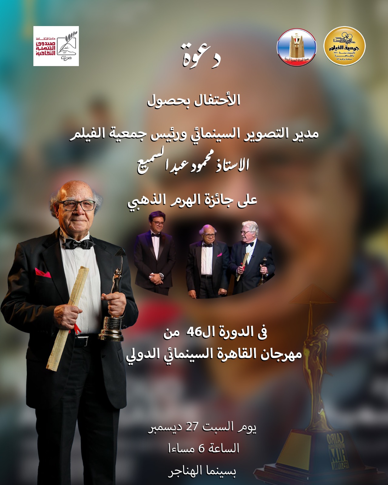 تنظم جمعية الفيلم مساء اليوم – السبت- احتفالية خاصة لتكريم مدير التصوير السينمائي ورئيس جمعية الفيلم الأستاذ محمود عبدالسميع، وذلك على مسرح الهناجر بساحة دار الأوبرا المصرية، احتفاءً بحصوله على جائزة الهرم الذهبي لإنجاز العمر من مهرجان القاهرة السينمائي الدولي 2025.