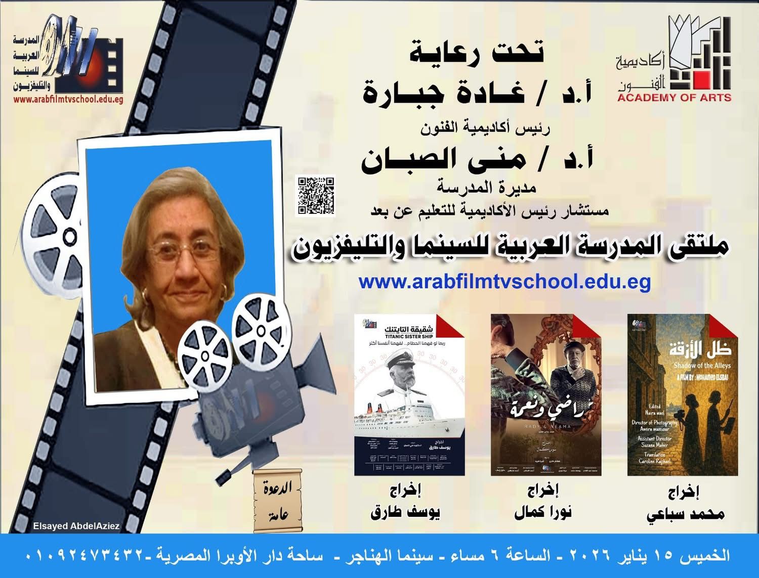 ينطلق غداً عرض فيلم ” شقيقة التايتنك Titanic sister Ship”، من إخراج يوسف طارق، في سينما الهناجر بدار الأوبرا المصرية غداً الخميس الموافق ١٥ من يناير الجاري، في تمام الساعة ٦ مساءً، ،المقرر عرضه في ملتقي المدرسة العربية للسينما والتليفيزيون ، تحت رعاية د.غادة جبارة، برئاسة د.مني الصبان، والمشرف علي تنفيذ الفاعلية السيد عبدالعزيز.