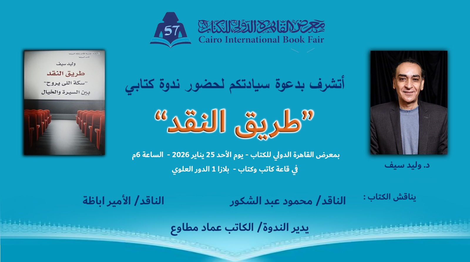 تنظم إدارة معرض القاهرة الدولي للكتاب ندوة ثقافية لمناقشة كتاب «طريق النقد» للكاتب والناقد د. وليد سيف، وذلك مساء الأحد 25 يناير 2026 في تمام الساعة السادسة مساءً.