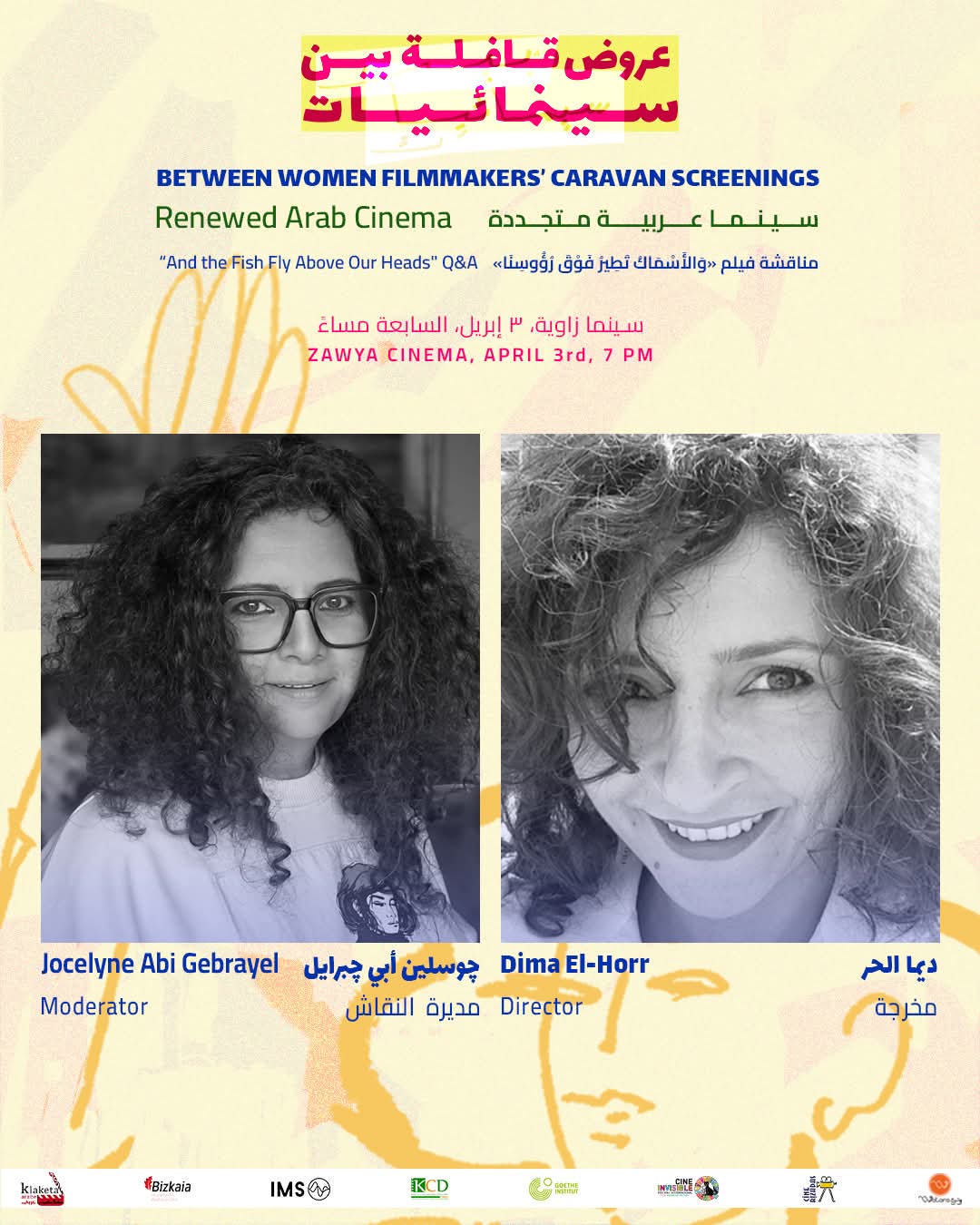 ضمن برنامج “سينما عربية متجددة”، تستضيف سينما زاوية مساء الجمعة 3 أبريل، في تمام السابعة، العرض المصري الأول للفيلم الوثائقي “والأسماك تطير فوق رؤوسنا” (2025)، للمخرجة اللبنانية ديمة الحر، وذلك ضمن فعاليات قافلة “بين سينمائيات”، وبسعر تذكرة مخفض يبلغ 60 جنيهًا.